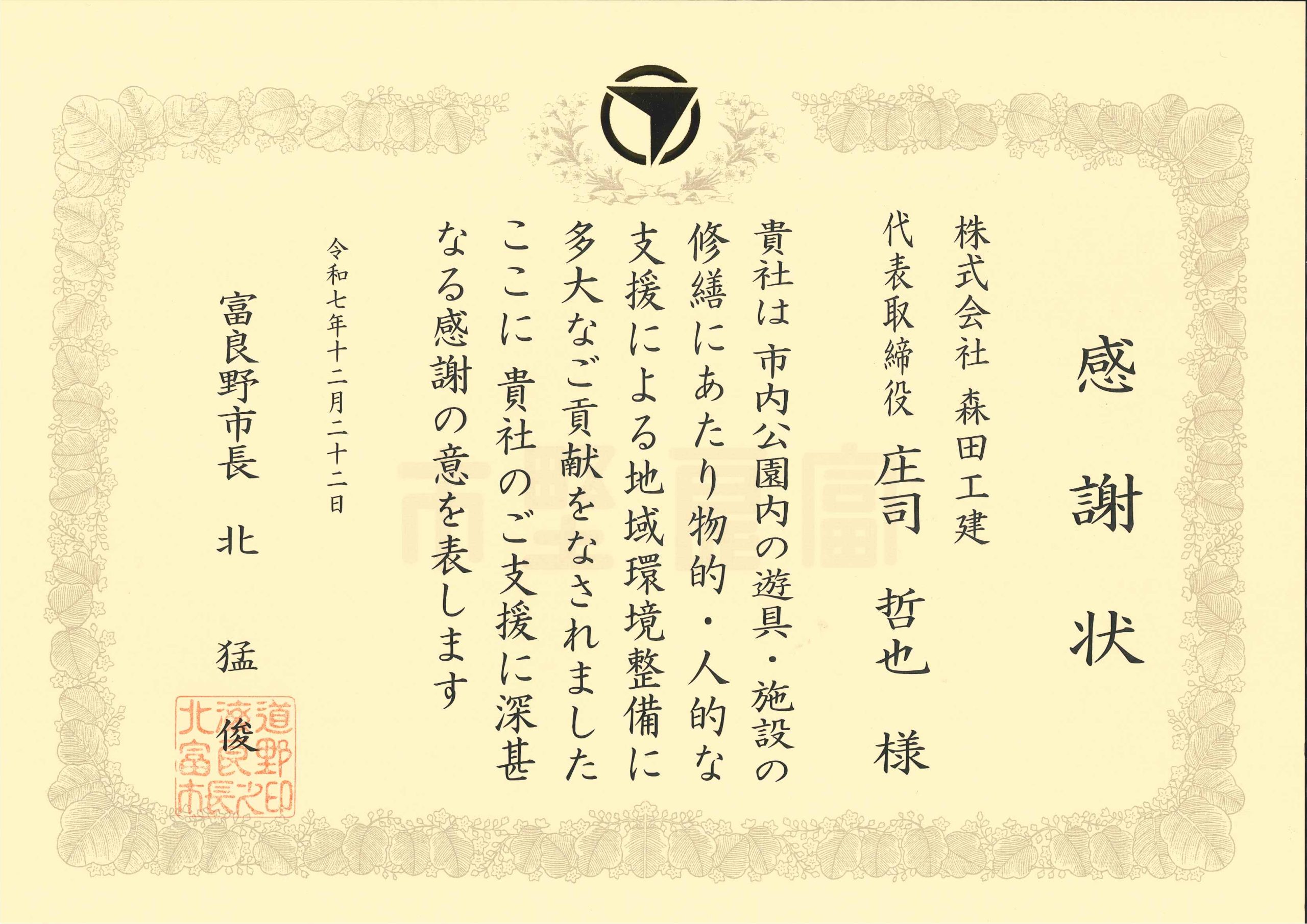 令和5年6月9日、富良野市より感謝状をいただきました。
